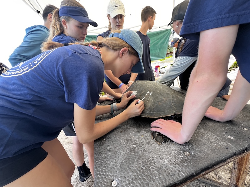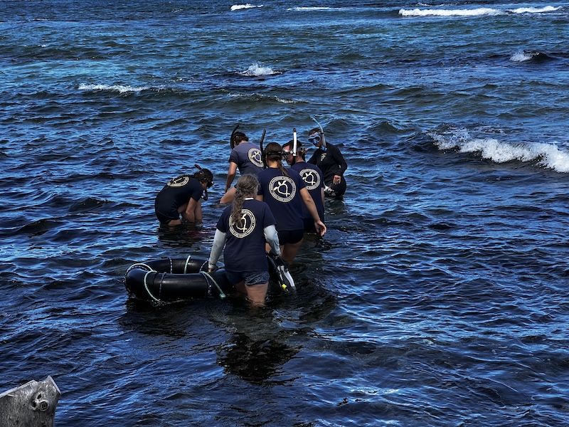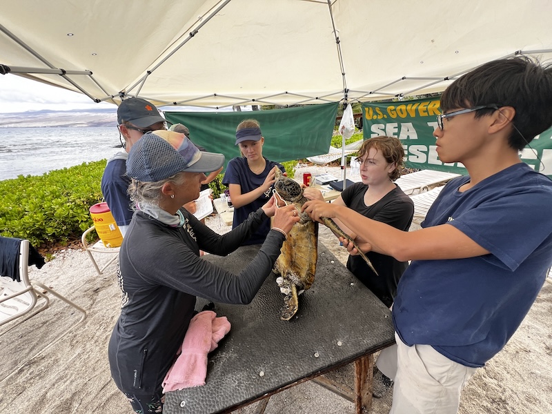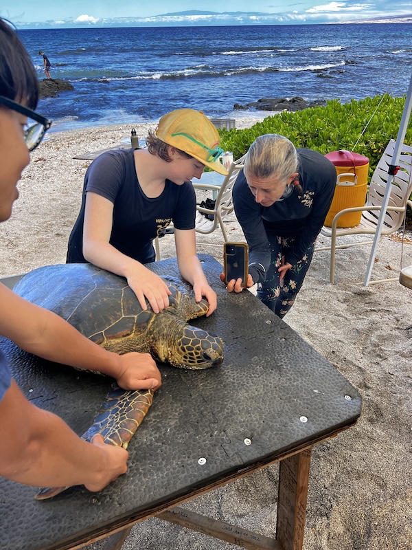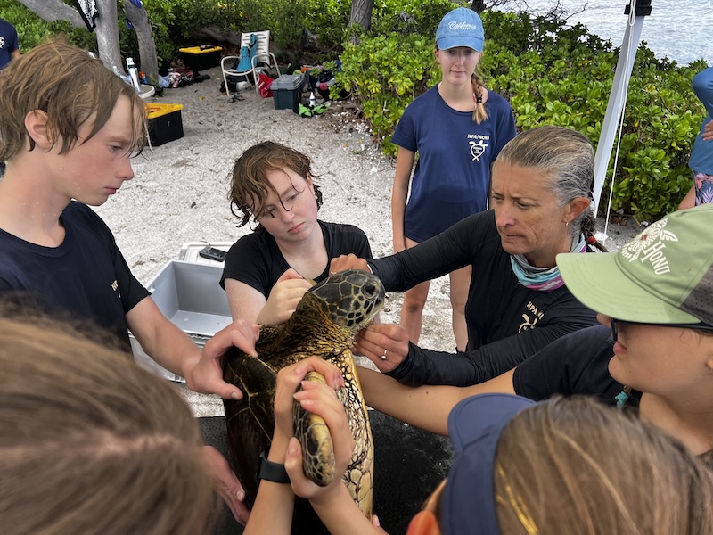 Laura Jim, Robyn Scarth and Marc Rice were joined by 12 HPA STRP student research volunteers to conduct in water capture work, data gathering, tagging and recording during a honu health assessment at 92 Puako Beach Road. During the day we were able to capture and process 14 honu. Nine honu were recaptures and 5 were first time captures. During the day we were joined by Rosanne Shank and George Balazs for a short visit. The weather was great and we were able to conduct our work safely and efficiently!
