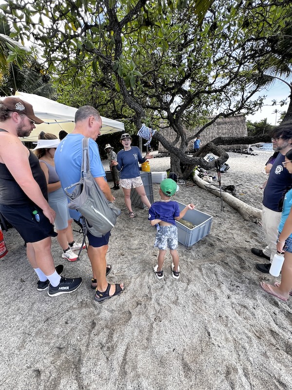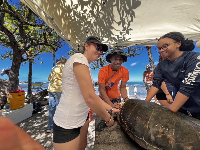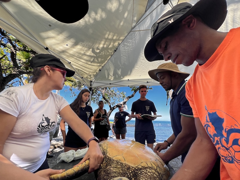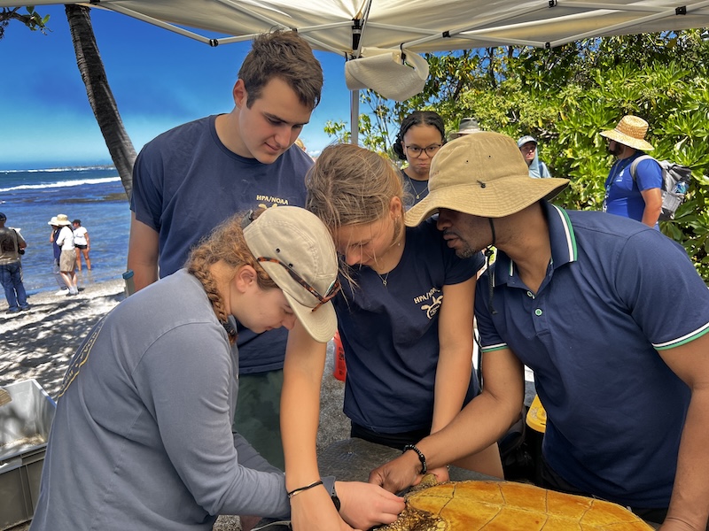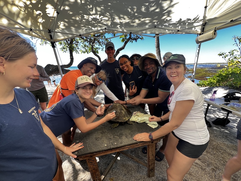 Laura Jim, Robin Scarth. Marc Rice and 7 HPA students traveled to Kaloko-honokohau National Historical Park to conduct a honu health assessment/tagging. We were joined by special guests Akwasi McLaren, Ketty McLaren and Andy Agyekumhene, all from Ghana. Also joining us were Rosanne Shank and George Balazs. We were assisted by NPS personnel and volunteers.